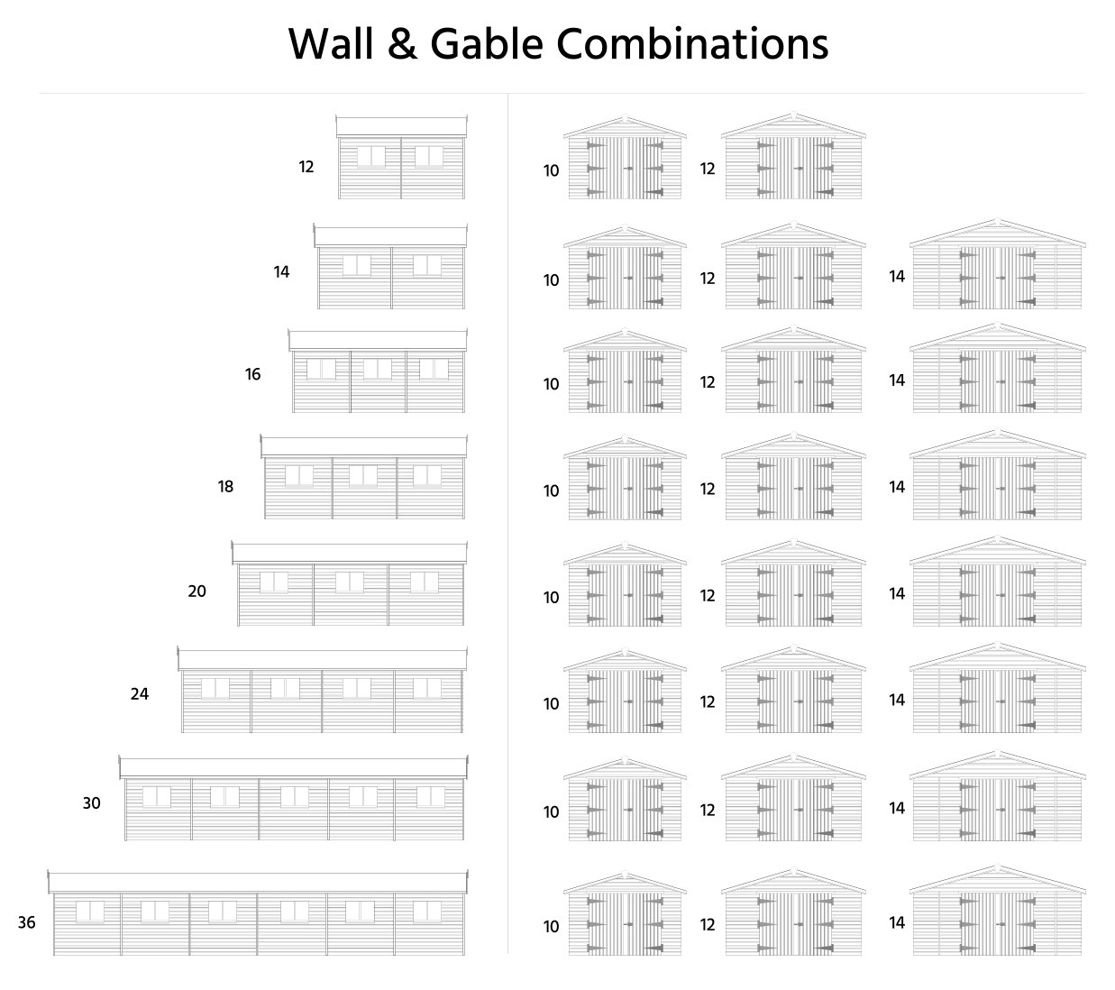 | Size | Length (ft) | Length (m) | Width (ft) | Width (m) | Eaves Height (ft) | Eaves Height (m) | Ridge Height (ft) | Ridge Height (m) |