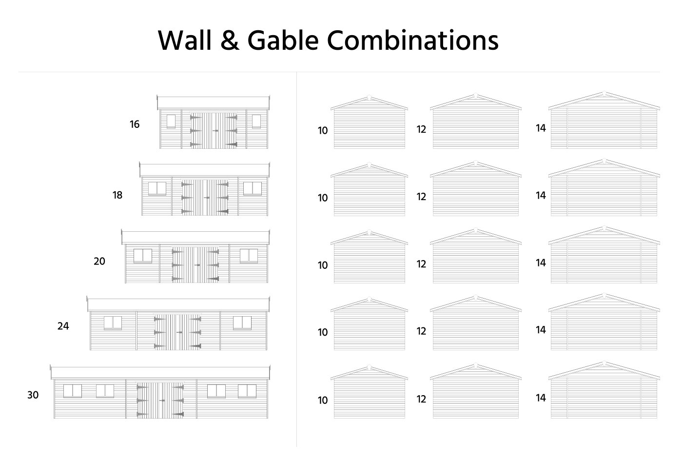 | Size | Width (ft) | Width (m) | Depth (ft) | Depth (m) | Eaves Height (ft) | Eaves Height (m) | Ridge Height (ft) | Ridge Height (m) |